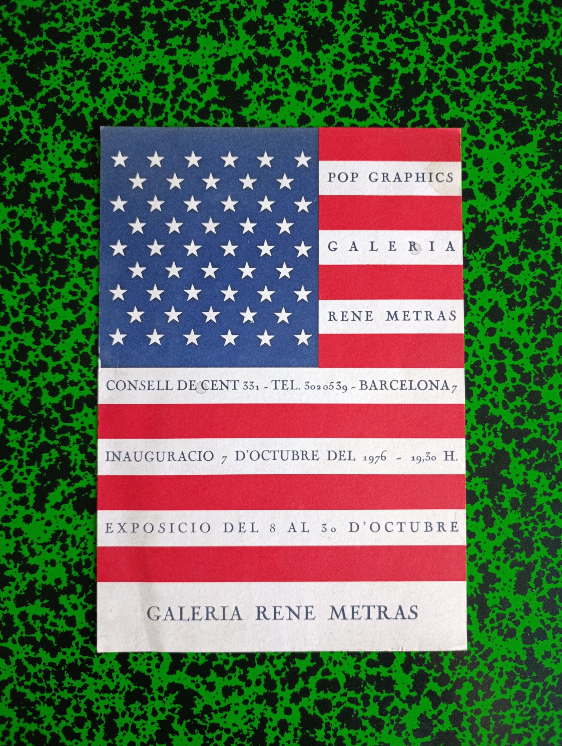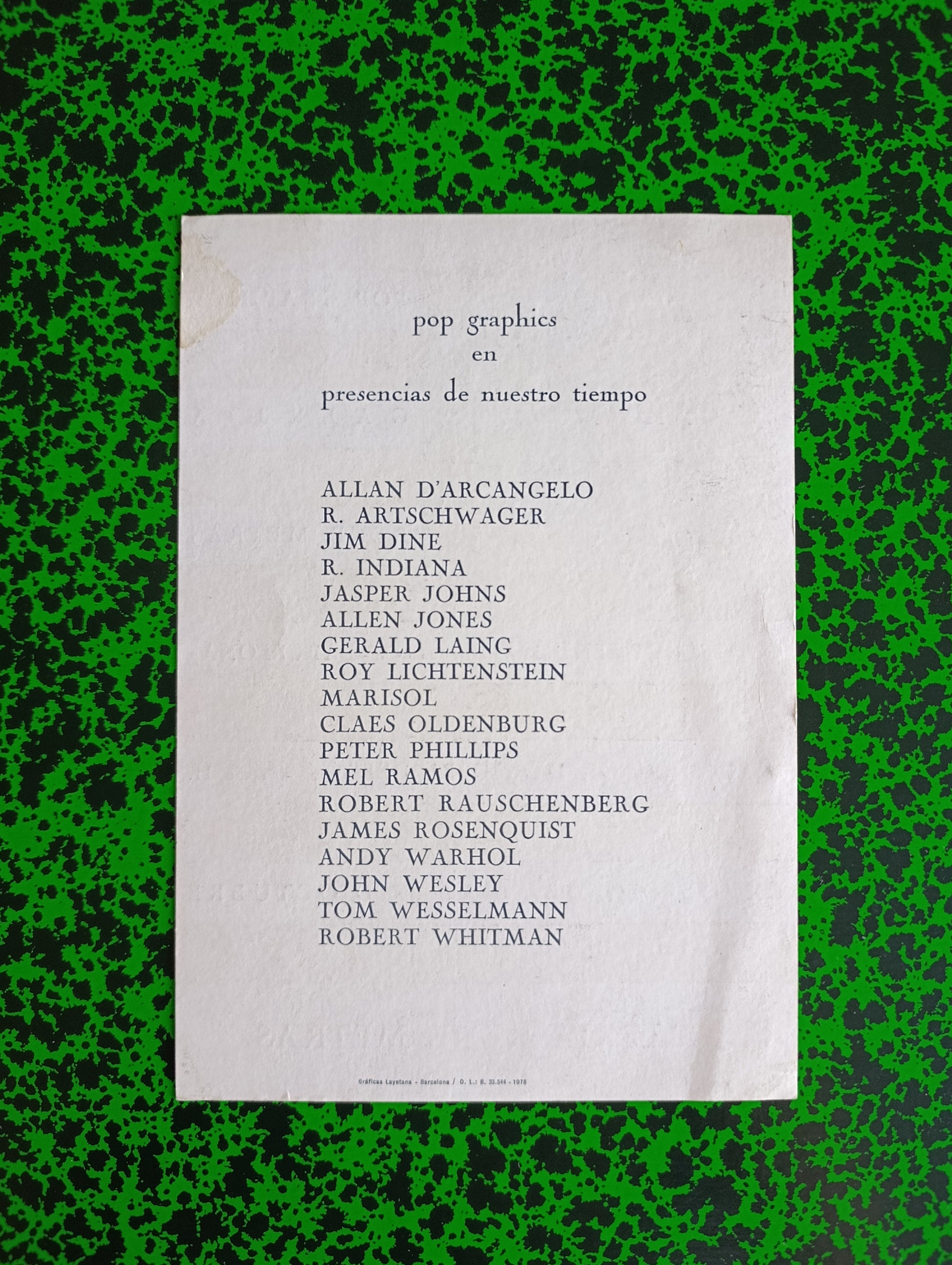 1976 Collective Exhibition "Pop Graphics" at Galería René Matrás, with a collection of american artist as, Llan D'arcangelo, R. Artschwager, Jim Dine, R. Indiana, Jasper Johns, Allen Jones, Gerald Laing, Roy Lichtenstein, Marisol, Claes Oldenburg, Peter Phillips, Mel Ramos, Robert Rauschenberg, James Rosenquist, Andy Warhol, John Wesley, Tom Wesselmann and Robert Whitman.